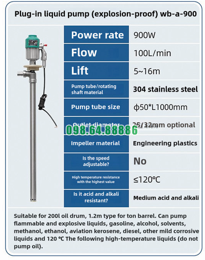 Nguyên tắc hoạt động của động cơ 900W trên Máy bơm chất lỏng inox 304 chống cháy nổ WB-A-900 cho phép thiết bị đạt lưu lượng lên đến 100L/phút. Công suất này đủ mạnh để xử lý nhiều loại dung môi và nhiên liệu.