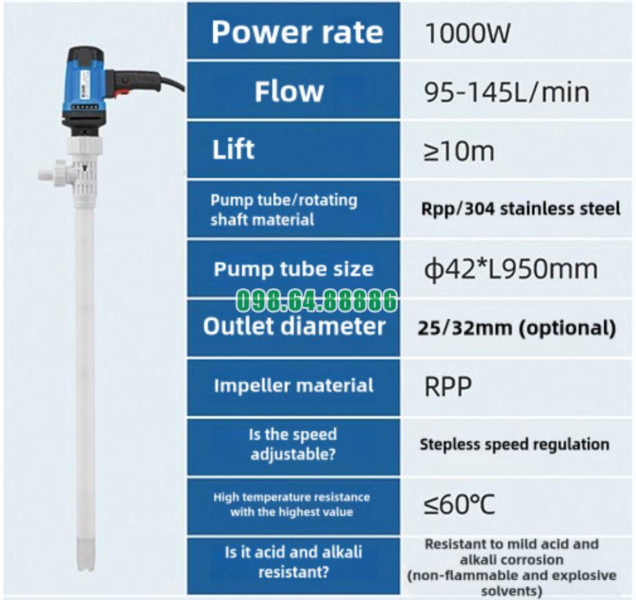 Trong môi trường sản xuất công nghiệp hiện đại, năng suất làm việc là yếu tố quyết định đến hiệu quả vận hành và khả năng cạnh tranh của doanh nghiệp. Bơm cắm điện thùng phuy model JDT-1000W-PVDF được thiết kế nhằm tối ưu hóa quy trình bơm hóa chất, qua đó giúp nâng cao rõ rệt năng suất công việc trong các nhà máy và khu công nghiệp.