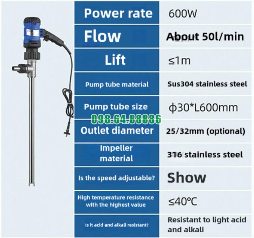 Bơm thùng phuy cánh 316 model JDT-600W-30SUS304