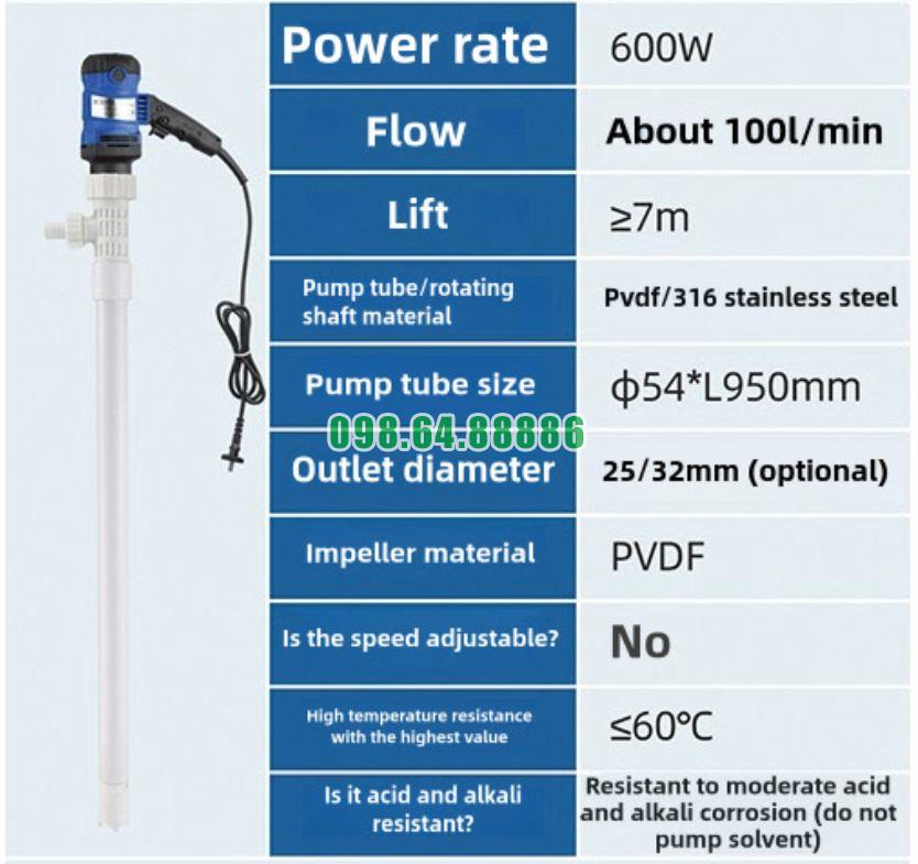 Máy bơm thùng phuy cắm điện JDT-600W-PVDF là giải pháp lý tưởng cho các quy trình chiết rót chuyên nghiệp, đặc biệt trong môi trường làm việc với hóa chất ăn mòn hoặc dung dịch tinh khiết.