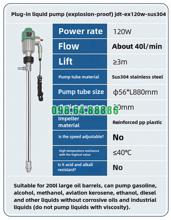 Hướng dẫn vệ sinh Bơm chất lỏng cắm điện chống cháy nổ JDT-EX120W-SUS304 sau khi dùng là bước quan trọng giúp duy trì hiệu suất, kéo dài tuổi thọ và đảm bảo an toàn khi thiết bị tiếp tục hoạt động. Đặc biệt khi bơm các chất như xăng, cồn hay methanol, việc làm sạch đúng cách sẽ hạn chế tồn dư dung môi và giảm nguy cơ cháy nổ.