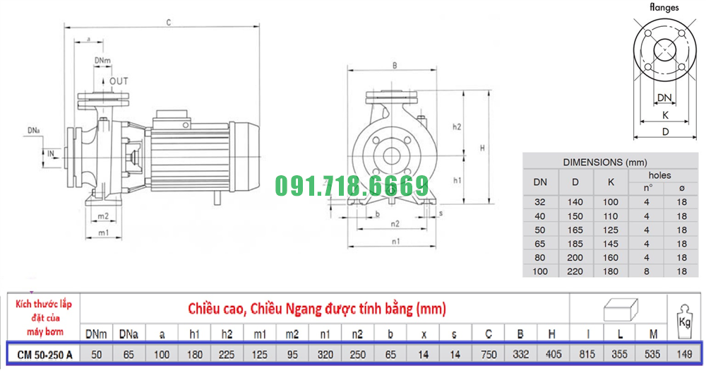 Thông số kỹ thuật bơm nước công nghiệp model CM50-250A