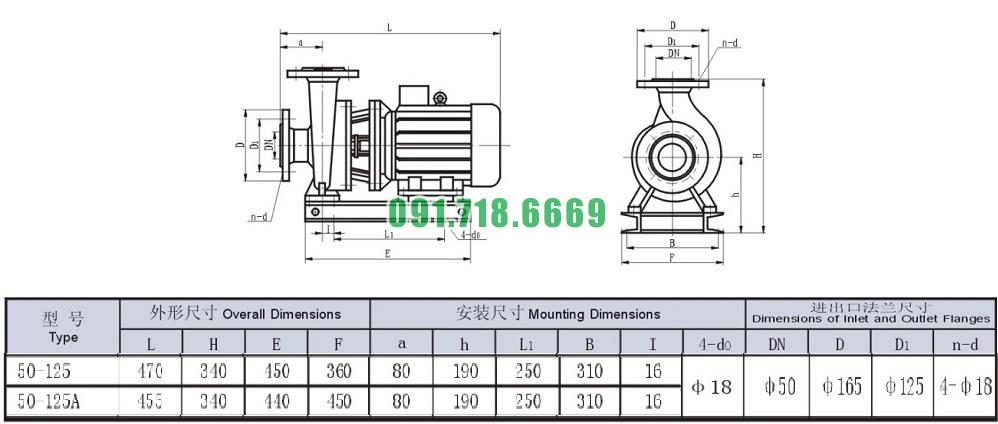 Bảng thông số kỹ thuật bơm nước nằm ngang mã SLW-ISW50-125 động cơ 1.5 kw