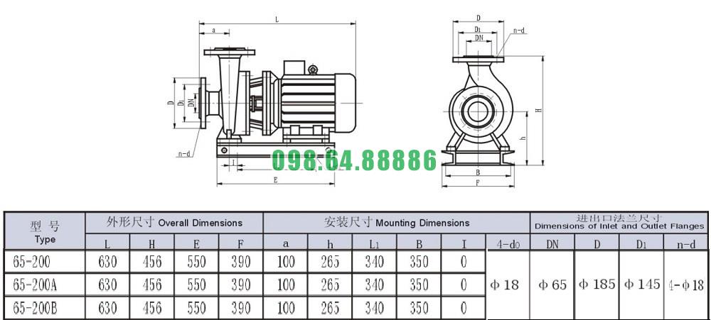 Bảng thông số kỹ thuật bơm nước nằm ngang SLW-ISW65-200
