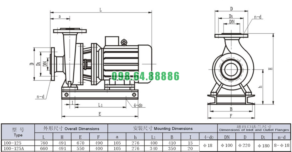 Bảng thông số kỹ thuật bơm nước nằm ngang SLW100-ISW100-125 vòng quay 2900 r/min