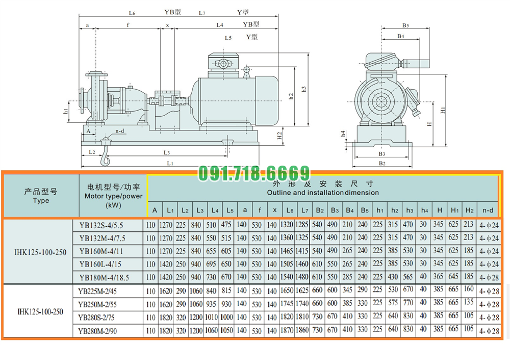Kích thước lắp đặt của máy bơm nước li tâm cánh hở IHK125-100-250 hiệu suất 240 m3/h