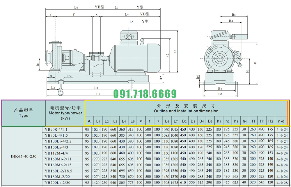 Kích thước lắp đặt của máy bơm nước li tâm cánh hở IHK65-40-250 kích thước Dn65