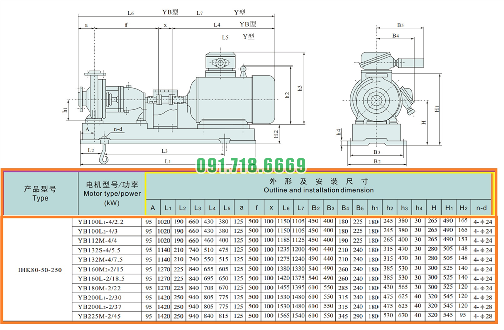 Kích thước lắp đặt của bơm li tâm cánh hở lưu lượng 13-60 m3/h model IHK80-50-250